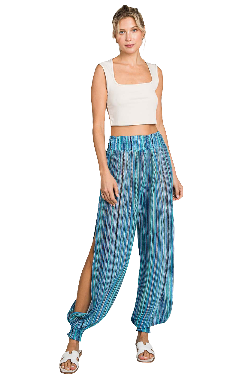 Striped Smocked Cover Up Pants are a chic and versatile choice for beach or poolside lounging, featuring a trendy striped pattern and comfortable smocked waist design. These stylish pants provide a relaxed and breezy fit, perfect for slipping on over swimwear for a fashionable beach day look. The smocked waist offers a flattering silhouette and ensures a comfortable and adjustable fit. The striped pattern adds a touch of nautical flair, while the lightweight fabric makes them ideal for warm weather. Elevate your resort wear with Striped Smocked Cover Up Pants that combine comfort, style, and a beach-ready vibe. Embrace laid-back elegance with these versatile pants that effortlessly transition from the beach to a seaside cafe.