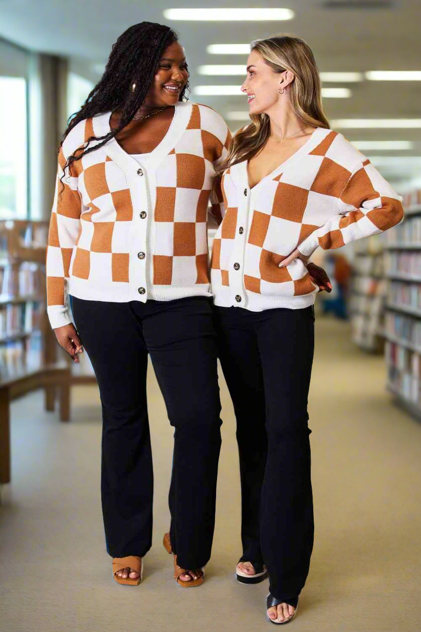 Button-Up V-Neck Check Mate Cardigan In Camel