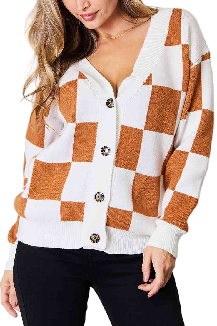 Stay cozy and chic with this checkered button-up V-neck dropped shoulder cardigan. The checkered pattern adds a trendy and eye-catching element to this classic cardigan, while the button-up design allows for versatile styling options. The dropped shoulder design adds a relaxed and comfortable fit, perfect for layering or wearing on its own. Stay stylish and warm with this must-have checkered cardigan.