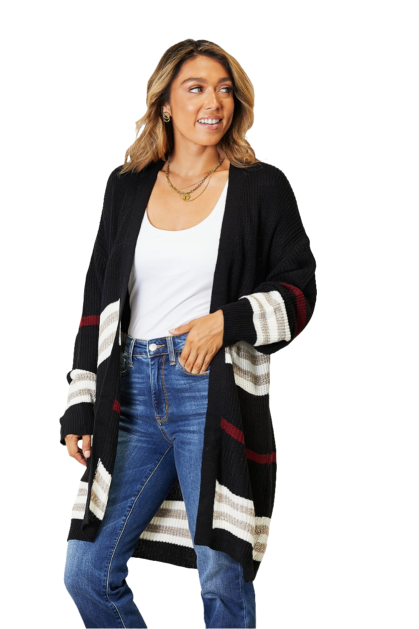 This Striped Rib-Knit Drop Shoulder Open Front Cardigan is both stylish and comfortable with its relaxed drop shoulder design. The unique striped pattern adds a playful touch, perfect for showcasing your fashion-forward taste or keeping cozy at home.