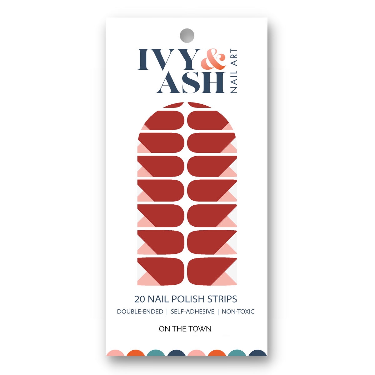 Our On The Town Nail Wrap Set features a fresh take on the traditional French tip mani. The “criss cross” tip is a major nail art trend, and the deep red and blush color combo transitions nicely from fall to holidays. Ivy & Ash nail art is inspired by and created for the modern woman who wants trendy nails for a great price, without the fuss of dry-time, chipping, and smudging. Our nail wraps are non-toxic, vegan, cruelty free, and long-lasting. Level up your nails from the comfort of your own home with our quick, easy to apply DIY nail wrap sets. DETAILS -Each set comes with 20 double-ended nail polish strips -Easy to follow application instructions included on the packaging -Self-adhesive strips, no heat or UV light required -Lasts up to 2 weeks -Non-toxic, made of real nail polish ingredients